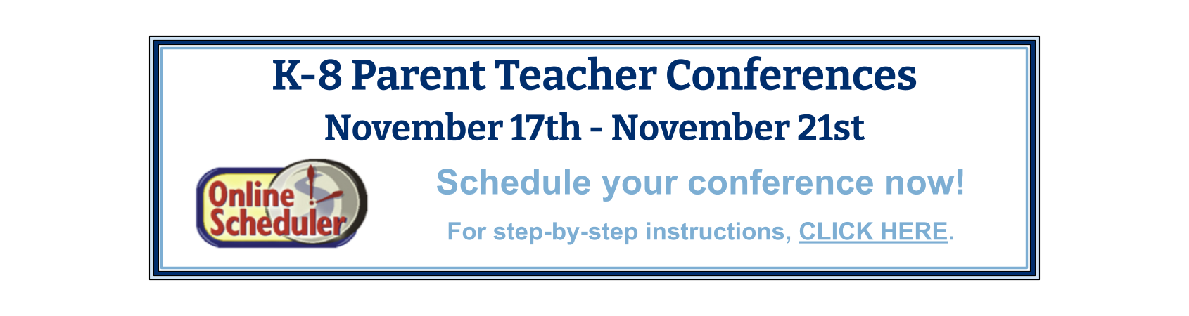 K-8 Conferences: Conference week is November 13th-17th. CLICK HERE to schedule your conference. The online scheduler is available through November 12th so reserve your conference time now. CLICK HERE for instructions on how to use the online scheduler. Kindergarten will dismiss at 1:00 PM and 1st–8th grade will dismiss at 1:30 PM. Our BASE program will be open after school until 6:00 PM each day.