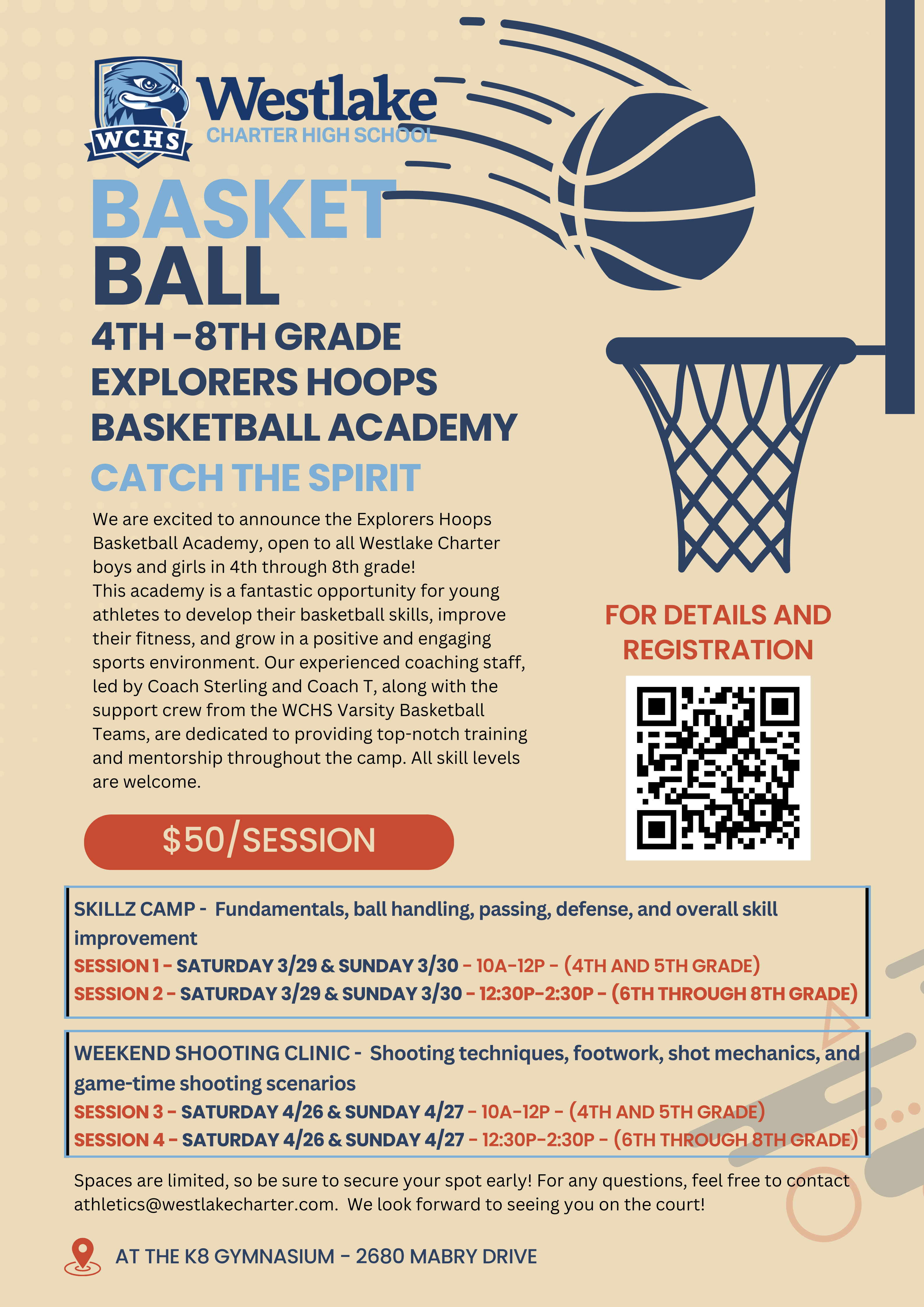Westlake Charter School is excited to announce our Explorers Hoops Basketball Academy! Open to all Westlake Charter school students in grades 4th-8th, this academy is a fantastic opportunity for athletes to develop their basketball skills, improve their fitness, and grow in a positive and engaging sports environment. Our experienced coaching staff and high school student athletes are looking forward to providing mentorship throughout the entire camp. We’ll see you there Explorers!